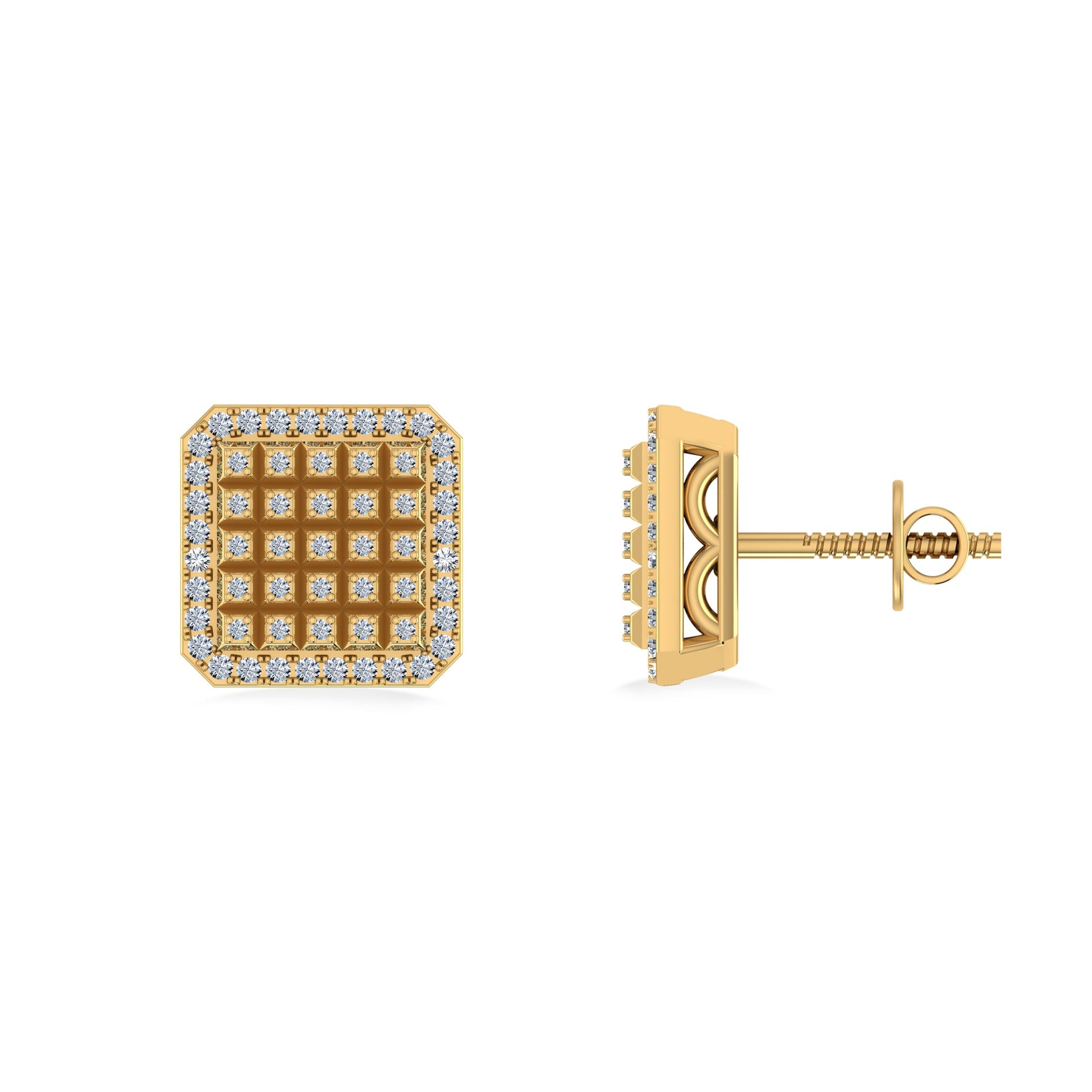 10K Yellow Gold Round Diamond Square Shape Designer Mens Stud Earring 1/5 Cttw