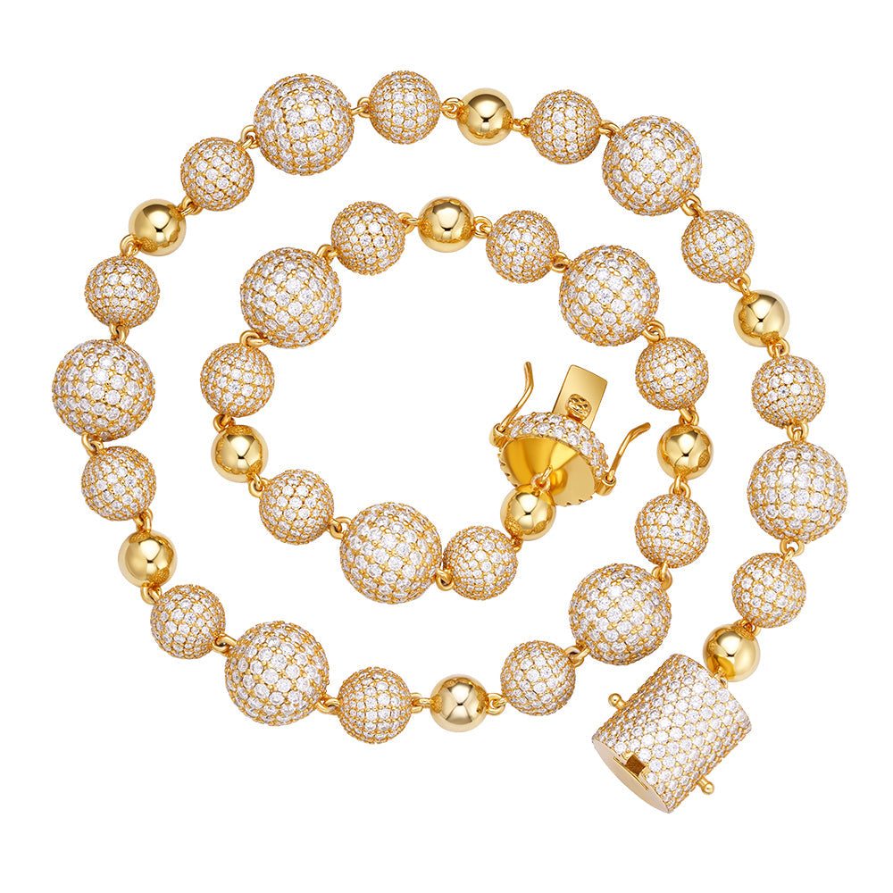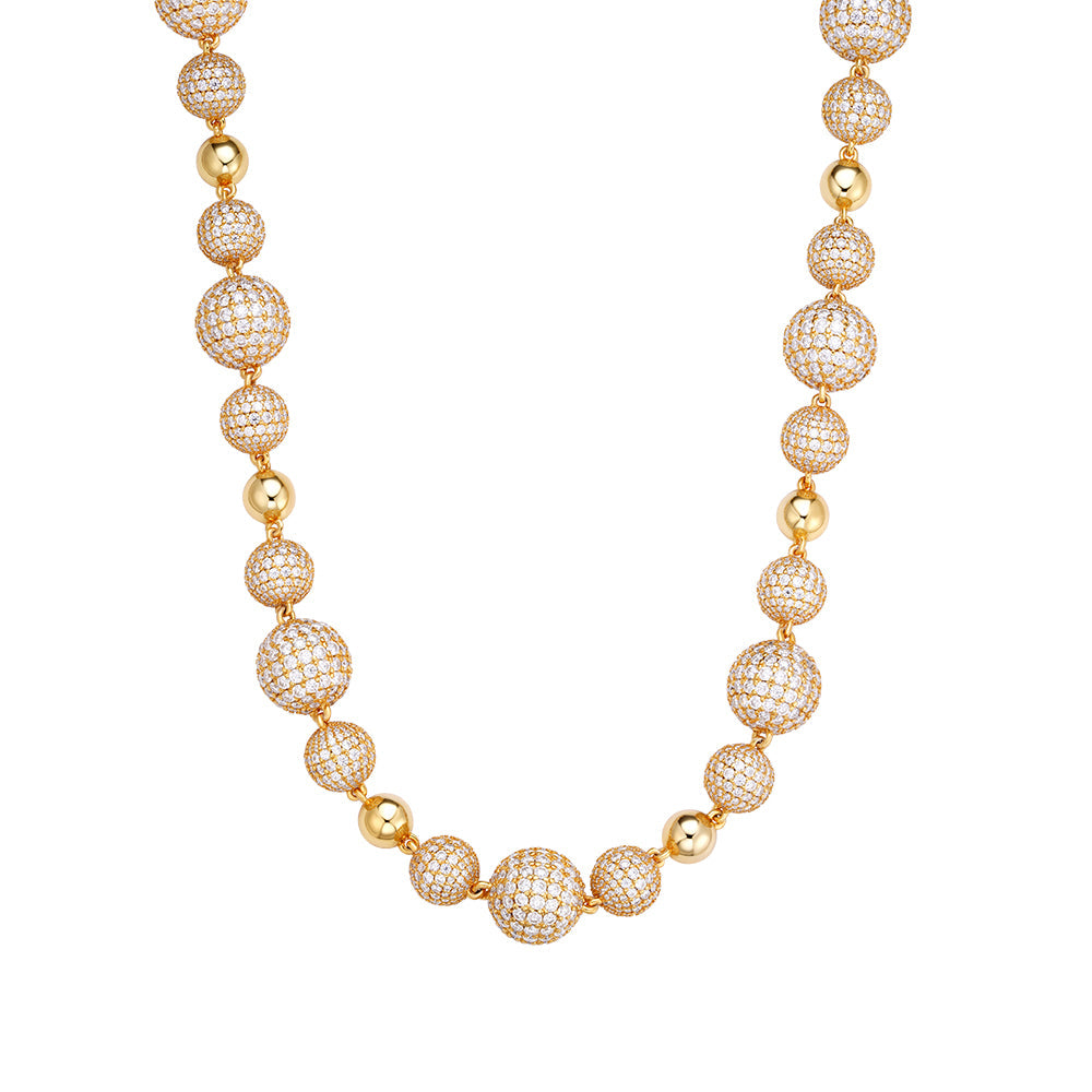 Elevate your elegance with this luxurious bead ball chain necklace in a radiant yellow gold tone, each bead is encrusted with dazzling prong set moissanite stones arranged in a stunning gradient of sizes for a dynamic visual appeal Smooth polished round beads adding balance and brilliance to the design, this necklace commands attention from every angle.