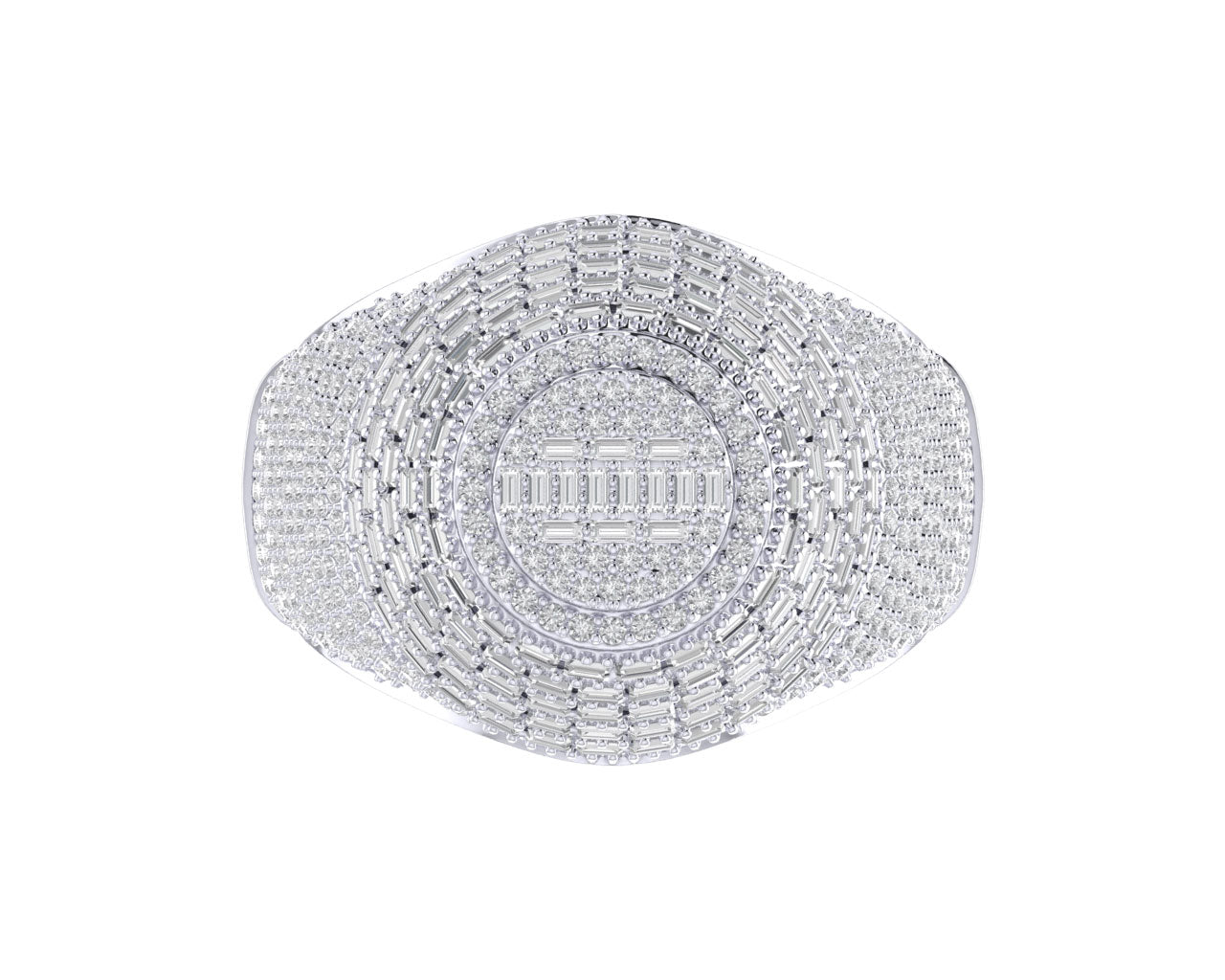 Turn heads with this bold and luxurious round-shaped cluster ring. Crafted in a stunning sterling silver finish, this ring features an intricate layout of shimmering round and baguette cut diamonds. The concentric round design highlights a brilliant center, surrounded by multiple tiers of baguettes and prong set stones, Perfect for making a statement, this ring embodies elegance and street-style flair.