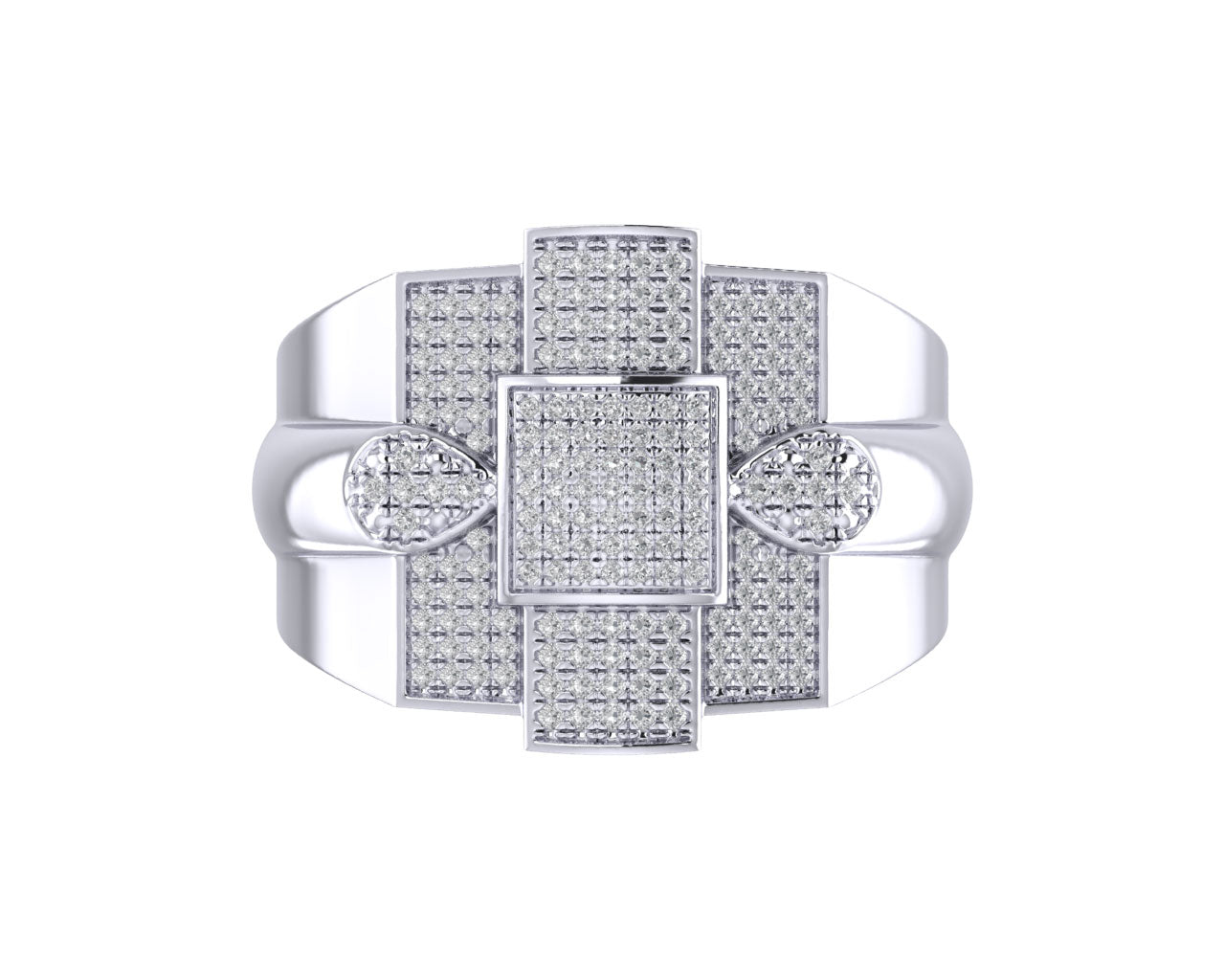 A bold blend of structure and shine, this elevated cross-block diamond ring is crafted for true statement-makers. Featuring a geometric, raised center design with multiple square and pear segments, each piece is covered with high-quality round diamond stones. The contrasting smooth metal sections highlight the brilliance even more, giving the ring a sculpted, modern aesthetic.