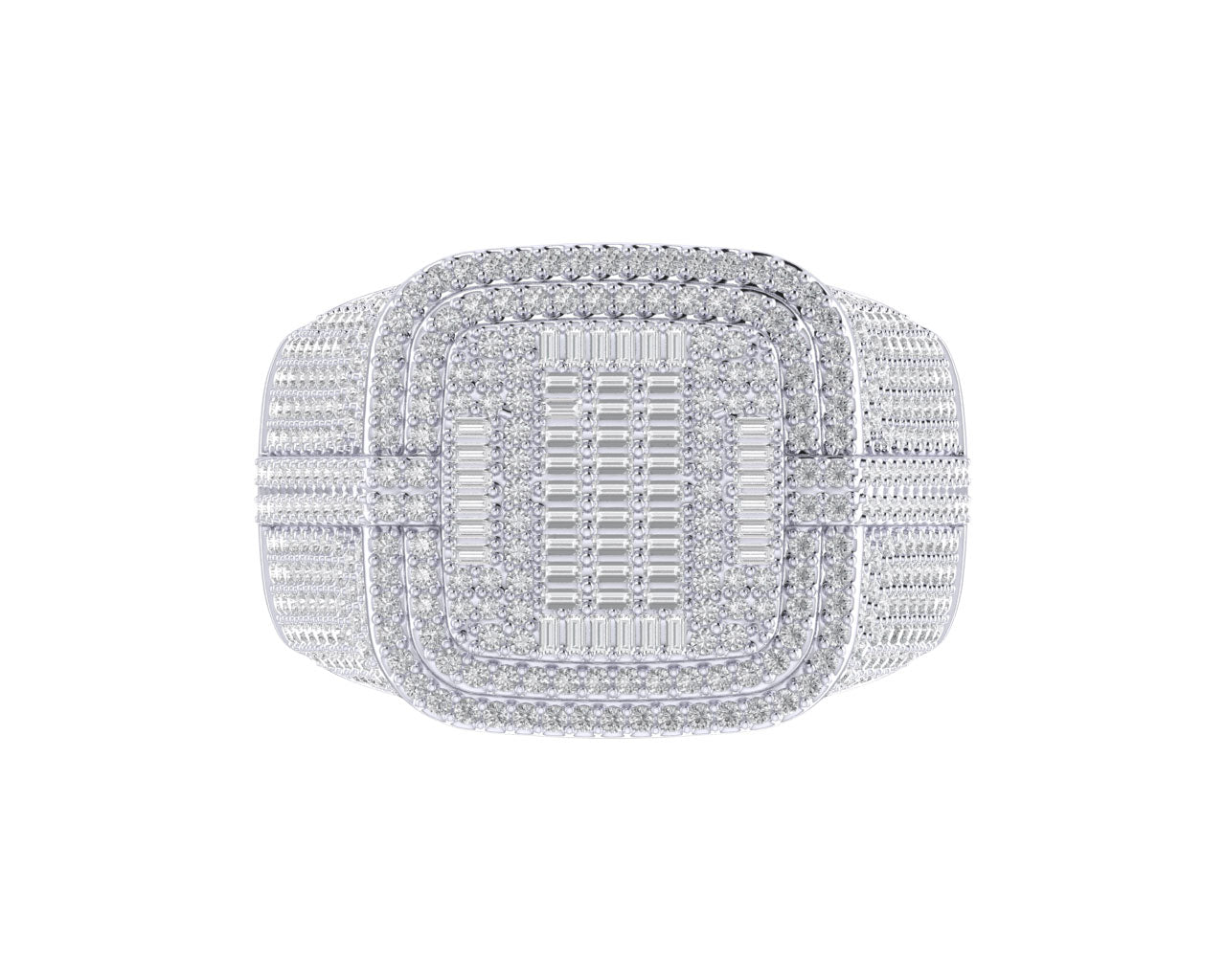 Level up your style with this round baguette diamond ring. Featuring a wide square top with a fully iced triple-layer structure, the centerpiece showcases vertically aligned baguette-cut stones framed by prong round diamonds for explosive brilliance. The wide tapered band continues the theme with diamond-flooded sides and a detailed under-gallery for added comfort and flair.