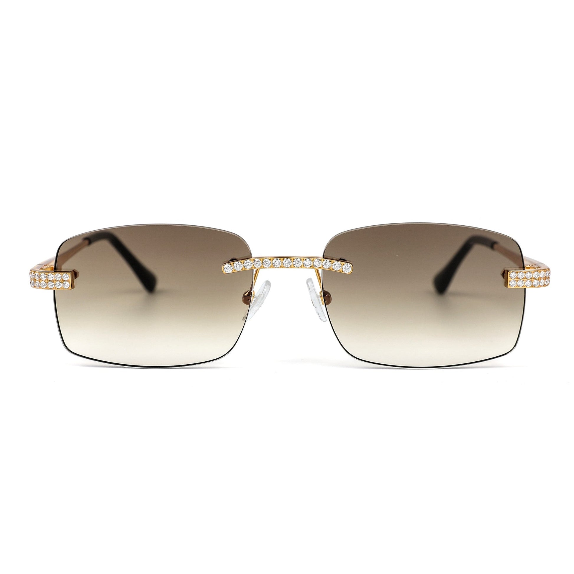 Elegance meets edge with these brown gradient square sunglasses, designed for those who appreciate understated luxury. Featuring rimless lenses, gold-tone arms, and moissanite stone detailing that catches the light just right this pair is all about bold sophistication.