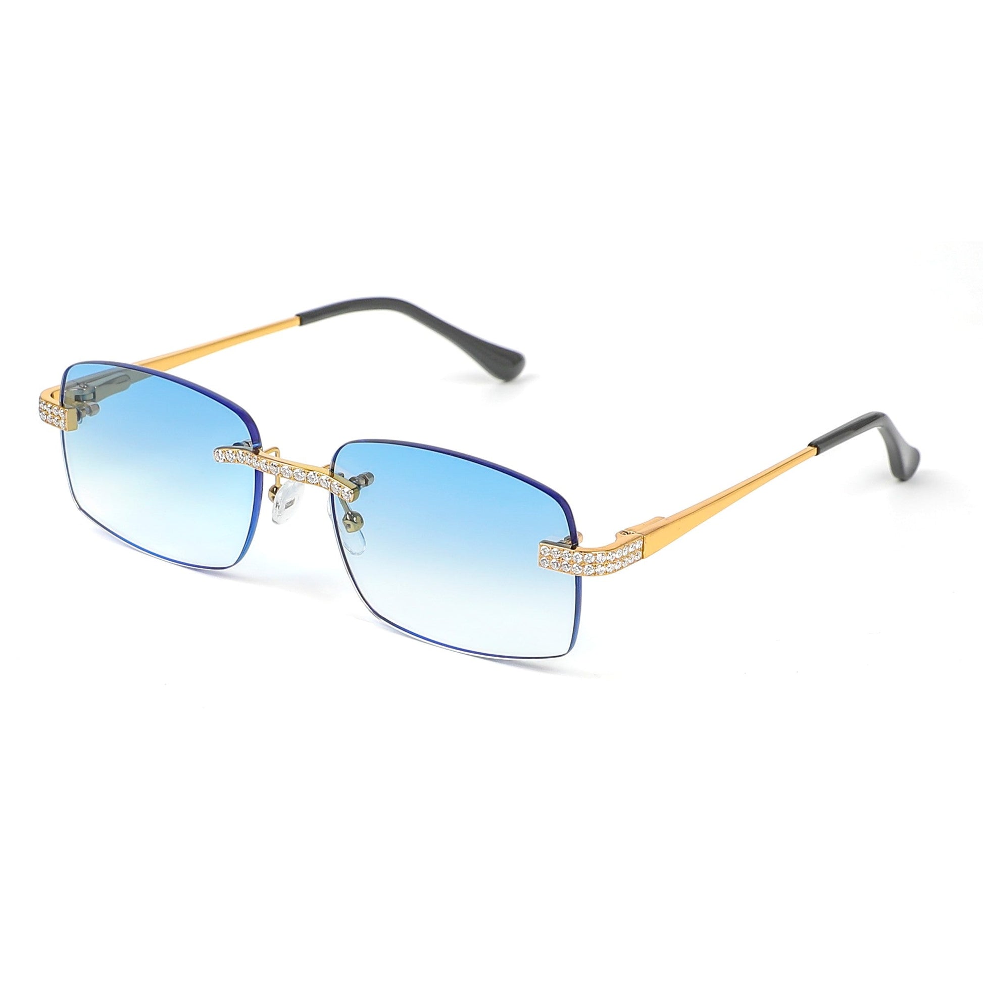 Dive into cool confidence with these blue square sunglasses, where crisp gradient lenses meet the fire of moissanite stone accents. Designed with a rimless silhouette and polished gold-tone arms, this pair is the perfect blend of edge, elegance, and everyday luxury.